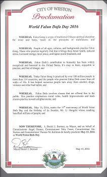 南佛州布劳沃德郡(Broward)的韦斯顿市(Weston)市长Daniel J. Stermer代表市专员 (Commissioner )Angel Gomez, Toby Feuer, Jim Norton 和 Thomas M. Kallman宣布5月13日为韦斯顿市 “法轮大法日”。