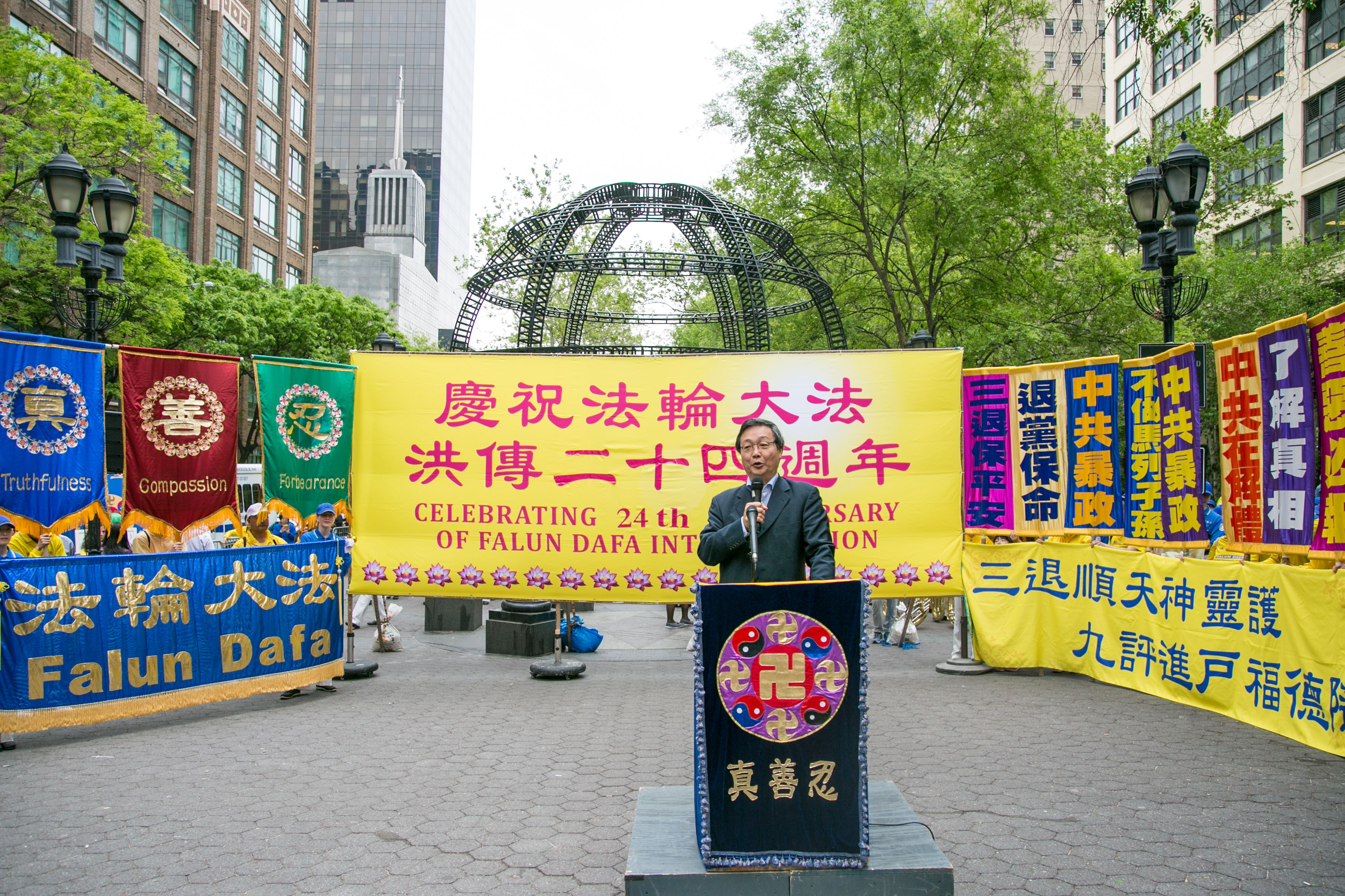 ![]() 图2: 二零一六年五月十三日,法轮功学员在纽约联合国公园集会,庆祝第十七届法轮大法日。图为香港法轮大法学会会长简鸿章在集会现场发言。 |