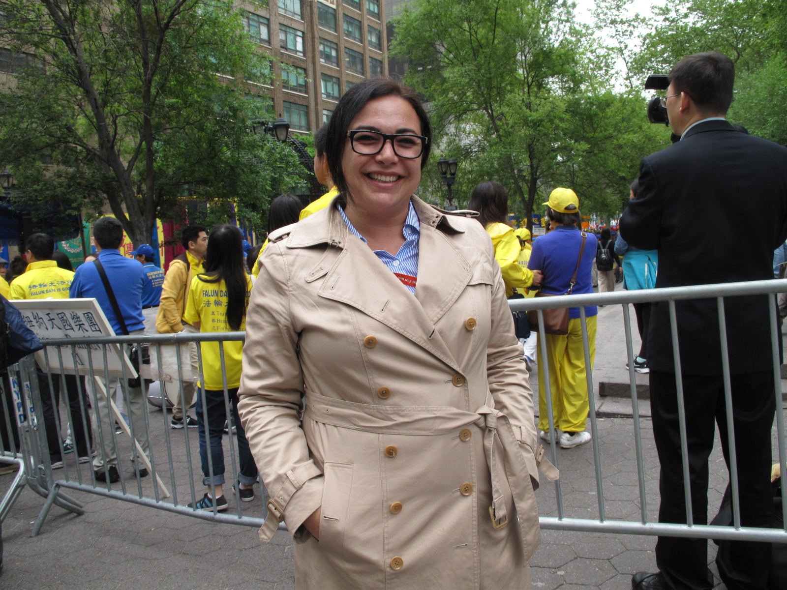 普利塞拉女士(Pryscilla Nicolau)来自位于美国迈阿密的圣托马斯大学,她在去联合国出席一个会议的路上遇到法轮功学员庆祝世界法轮大法日的盛大集会。