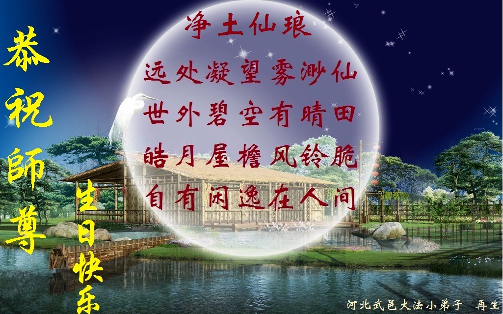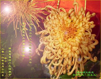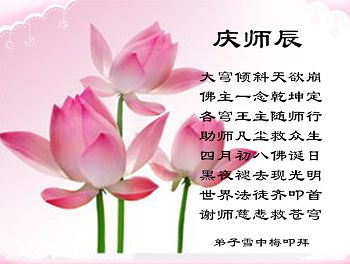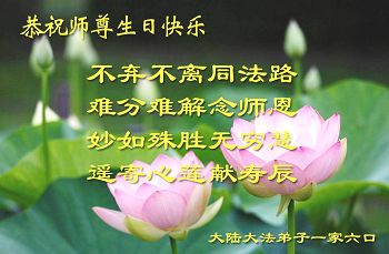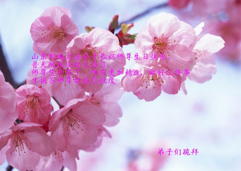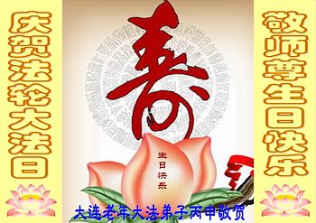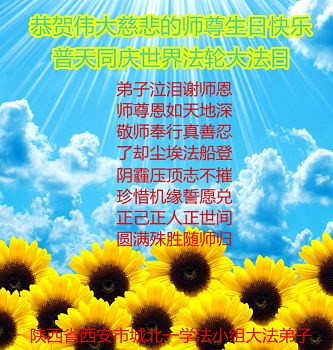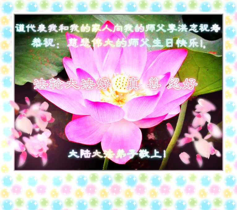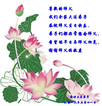 此信本是早早写好,却因种种原因到现在才发出,再过几天就是世界法轮大法日,是李洪志大师的生日,至此送上我最衷心的祝福,祝您生日快乐!与日月同辉!