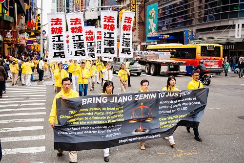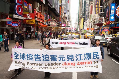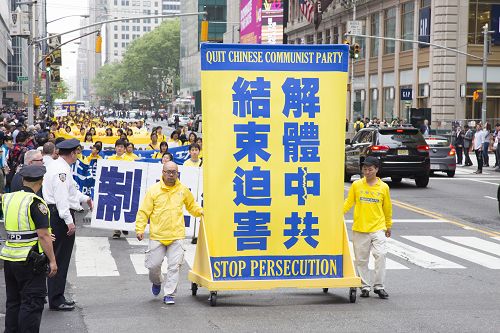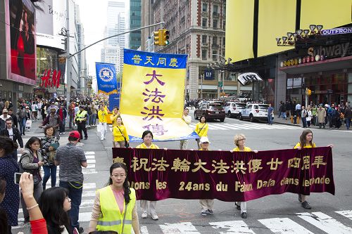 游行由三个大方阵组成:法轮大法好,停止迫害法轮功和声援二亿三千多万中华儿女退出中共。三个方阵都由天国乐团打头阵,浩浩荡荡的队伍在联合国达格•哈玛绍广场公园(UN Dag Hammarskjold Plaza Park)集合,从曼哈顿四十七街二大道出发,横跨四十二街,途经时代广场,最后抵达中领馆旁的十二大道,历时三个半小时。壮观的游行让很多各界人士驻足观看,并了解了法轮功的真相。游行结束后,许多纽约人看到身穿黄色体恤衫的法轮功学员就主动打招呼,并说:“哦,法轮功,今天你们的活动是纽约最大的事。”