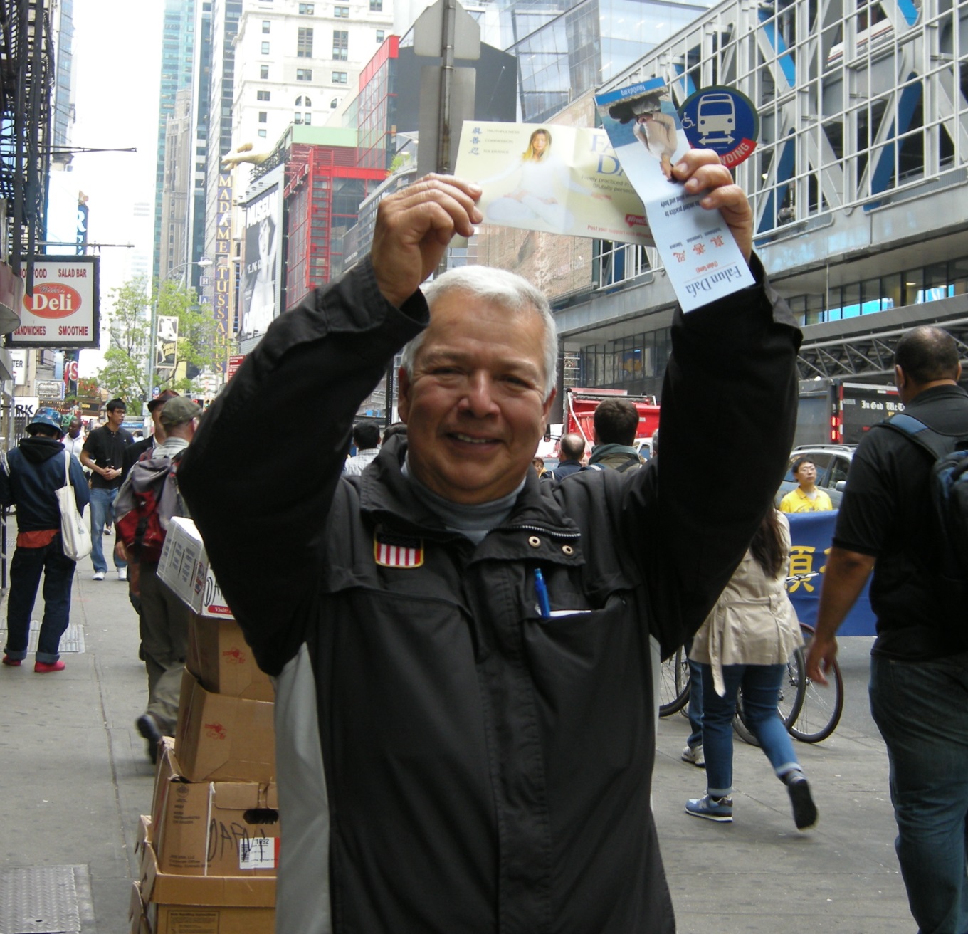 纽约表演艺术家 Dan Diggles 从事表演艺术和教学很多年,他看到游行后对法轮功很感兴趣,并询问学员这是什么?学员给他介绍法轮大法的真相后,他要了真相传单,说回家后会仔细阅读。