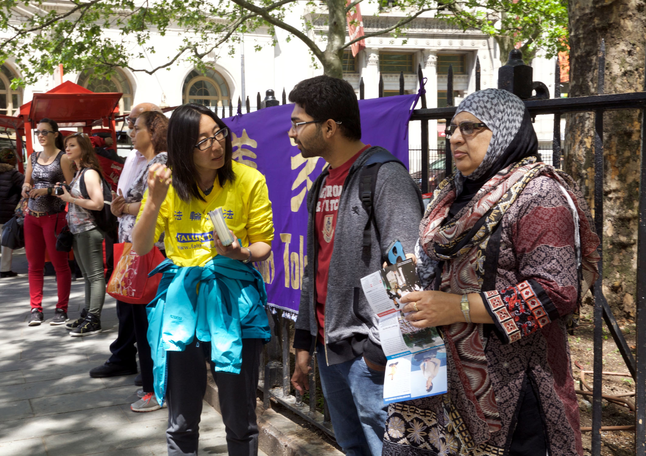 鲍林格林公园(Bowling Green Park)法轮功学员的炼功场景吸引了游客们的注意。一对来美国旅游的北京中年夫妇对法轮功学员表示:“我们都知道共产党很坏。”他们表示自己是基督家庭教会的教徒,共产党对家庭教会的教徒同样迫害,“但是没有象对你们(法轮功学员)那么严重。”提到三退(退出中共党团队),他们说:“在国内法轮功学员也告诉我们,‘中共干了那么多伤天害理的事情,上天一定会惩罚它的,它让人们为它献身,是在害人,我们希望善良的人能离开它。’”炼功现场的法轮功学员为他们俩起了化名“心明、眼亮”,俩人痛快做了三退,连声表示“好好好。”