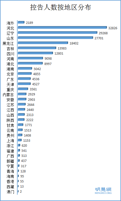 控告状来自地区涵盖中国大陆所有三十三个省级行政区;三百三十三个地级行政区(地级市、地区、自治州、盟,全国共三百三十四个地级行政区);一千九百四十八个县级行政区(县、自治县、旗、自治旗、县级市、市辖区、林区、特区)。其中控告人数超过万人的有:河北三万二千八百二十六人,辽宁二万九千二百六十八人,山东二万七千七百零一人,黑龙江一万八千四百零二人,吉林一万三千九百八十三人,四川一万二千八百零一人。