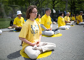 二零一六年五月十四日清晨,上百名从欧洲来到纽约参加法轮大法日庆祝活动的部分法轮功学员,在美国国家博物馆门前广场,通过集体炼功活动传播大法美好。