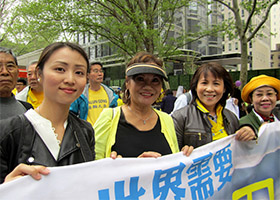 五月十三日,来自世界五十多个国家的近万名法轮功学员会聚美国纽约市,他们身穿各民族节日盛装,在曼哈顿举行盛大游行庆祝法轮大法日。