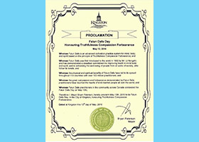 第十七届世界法轮大法日前夕,加拿大安大略省金斯敦市宣布二零一六年五月十三日为“法轮大法日”,颂扬“真善忍”的原则。