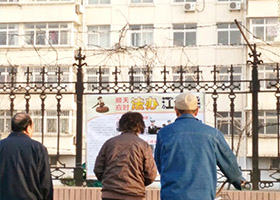 大陆北方某地街头巷尾皆可看到诉江真相展板;山东省龙口市的诉江真相展板吸引居民驻足观看;沈阳地区居民区的诉江展板