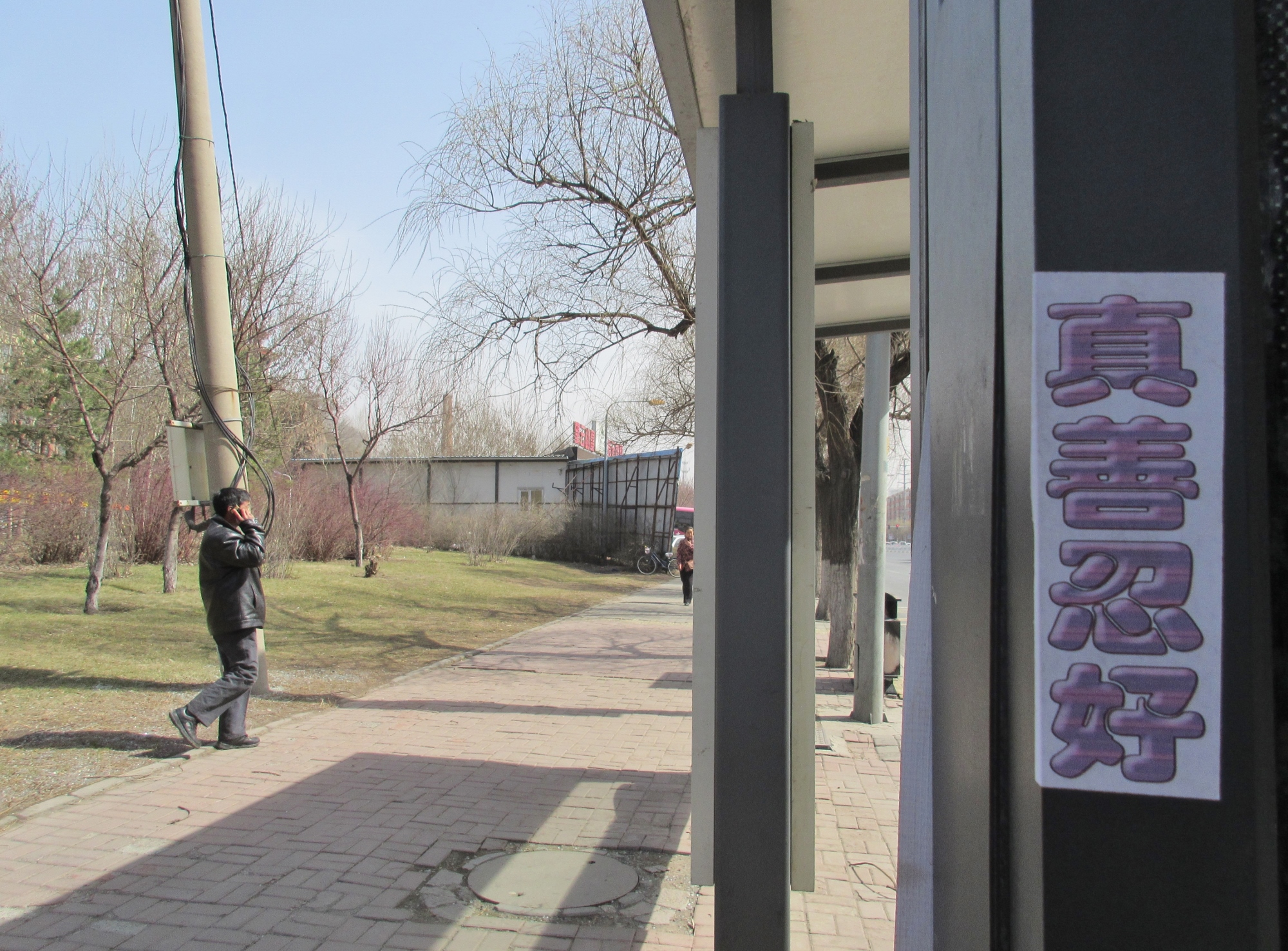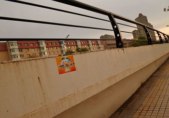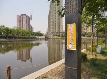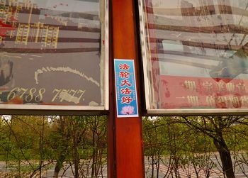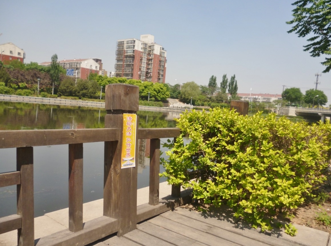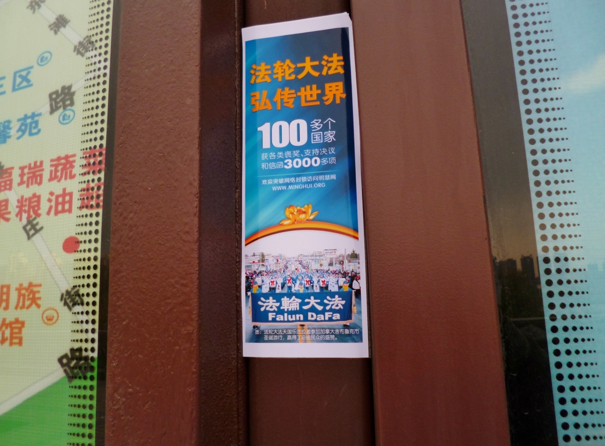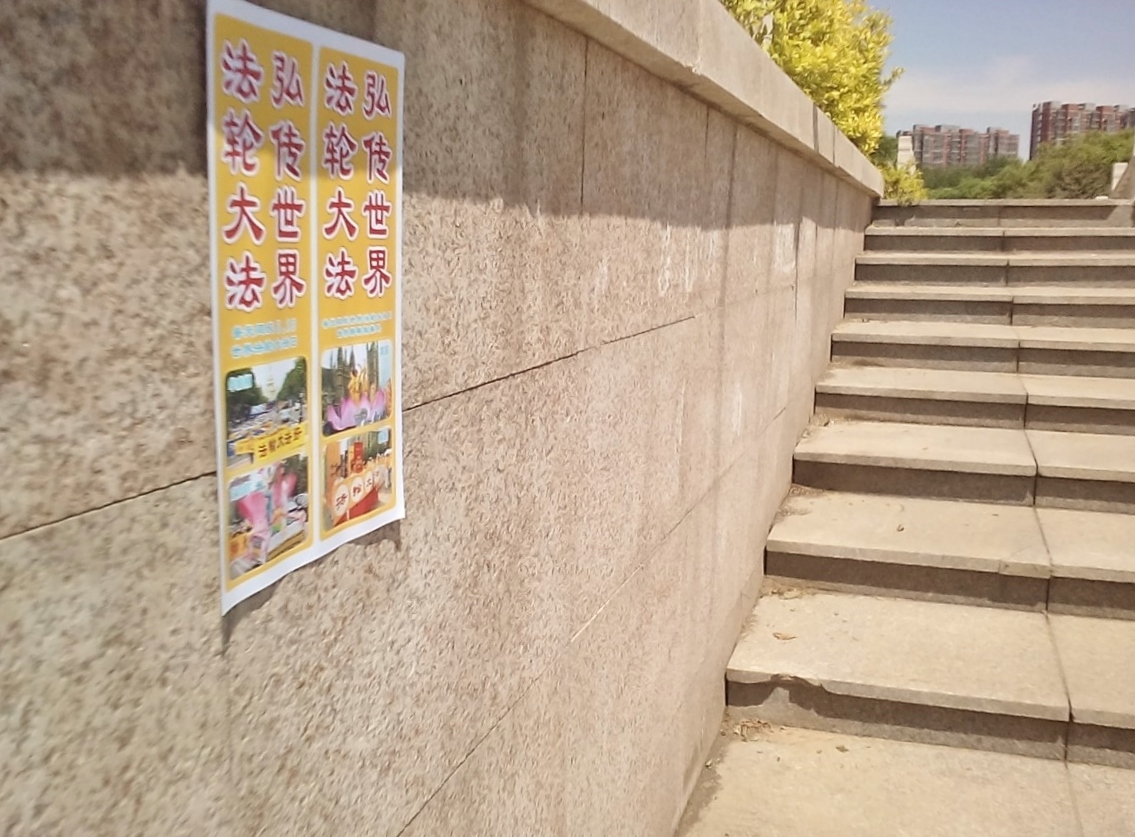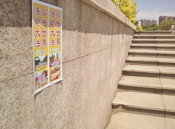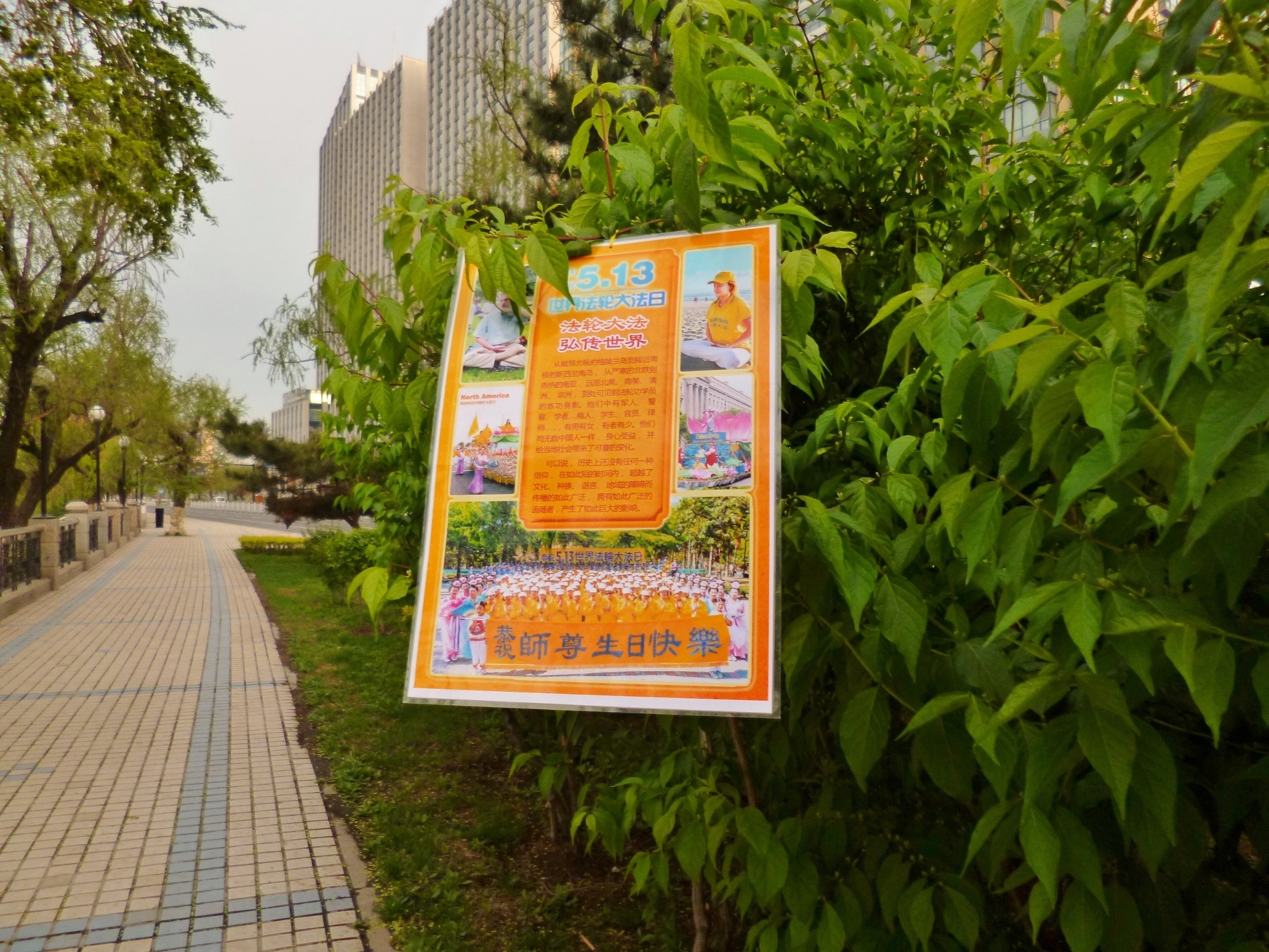 二零一六年五月八日,吉林市法轮大法学员满怀喜悦,恭祝师父华诞,庆祝即将来临的“世界法轮大法日”,将三十多不干胶和挂展贴在吉林市的大街小巷,将法轮大法的美好传递给吉林市民众。
