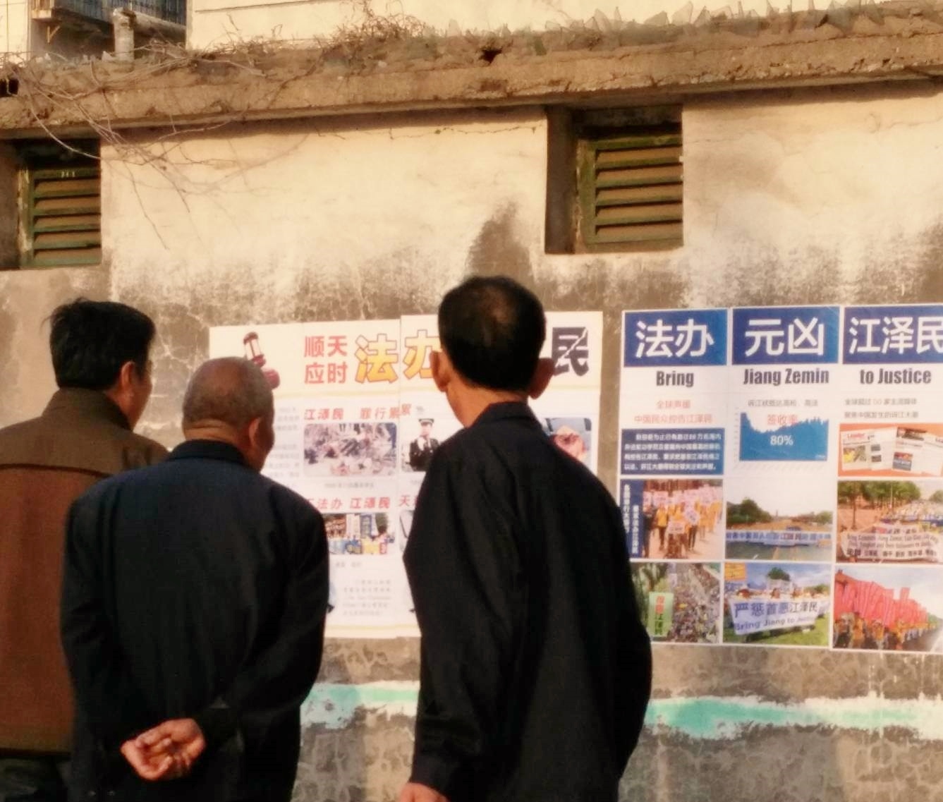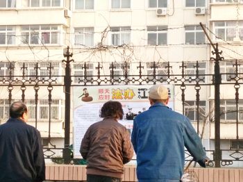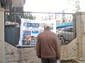 山东省龙口市的诉江真相展板吸引居民驻足观看