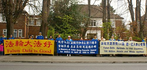 【明慧网二零一六年五月二日】二零一六年四月二十五日,爱尔兰法轮功学员在中国驻爱尔兰使馆门口举行了和平集会,纪念万名法轮功学员和平上访十七周年,并抗议中共对法轮功的迫害