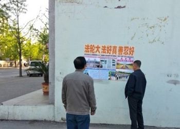 丹东地区的真相展板吸引路人观看;湖南省郴州市的真相展板吸引路人观看;苏州城的真相展板和吊挂;山东省烟台市喜见庆祝世界法轮大法日条幅和不干胶