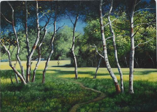 作品说明:表现的是大陆旅游景点,后面是旅游车。大法弟子写完法轮大法好,离开。