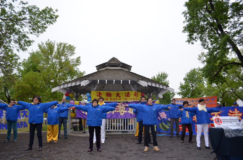 当地法轮功学员表演了腰鼓、古筝、诗朗诵、小合唱,并展示功法,庆祝世界法轮大法日,表达对师父李洪志先生的感恩。