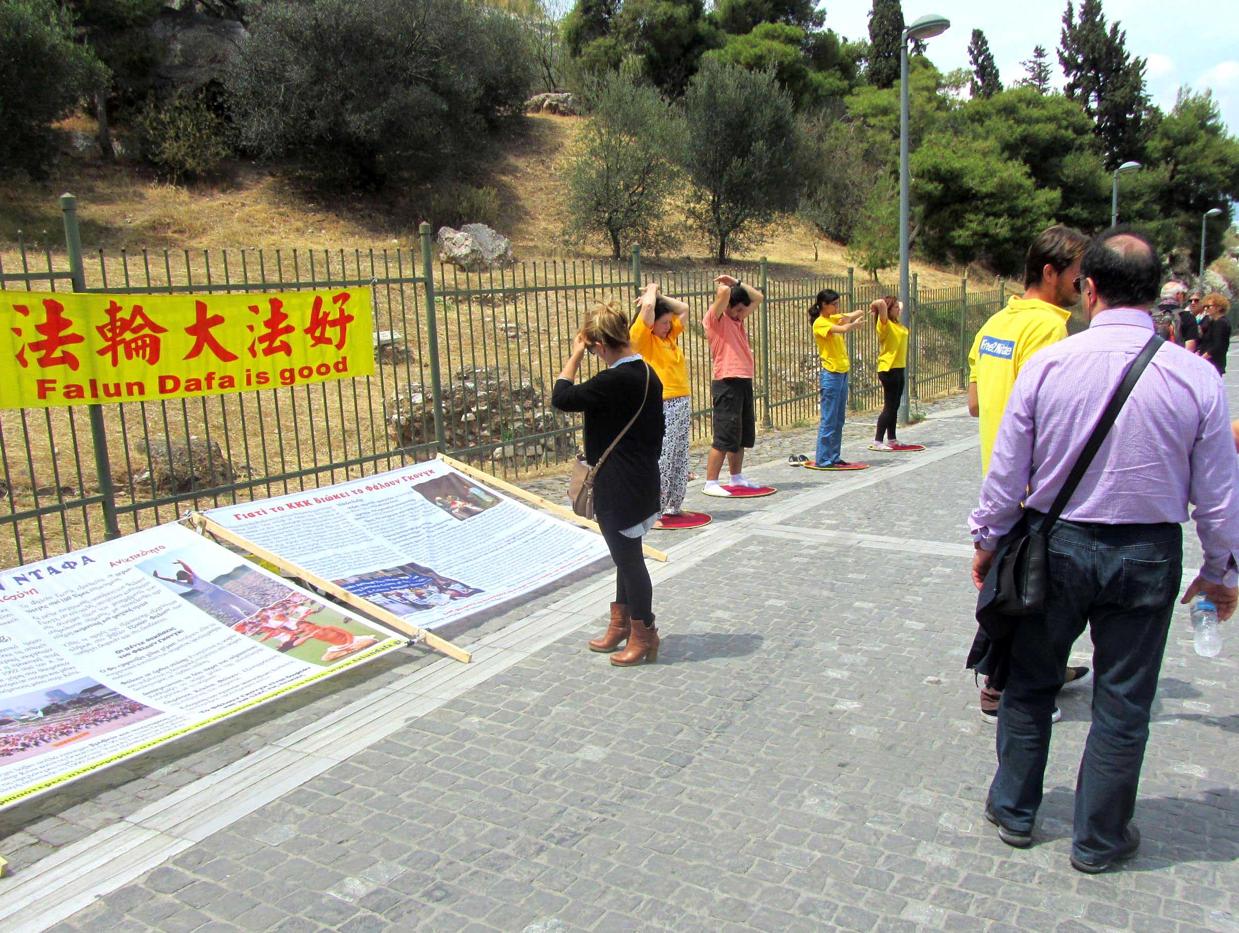 法轮功学员还在旅游景点雅典卫城(Acropolis)向游客们展示法轮功功法。祥和的炼功场面吸引了许多游客驻足。他们了解了法轮功,以及发生在中国的迫害,包括中共活体摘取法轮功学员器官的暴行。