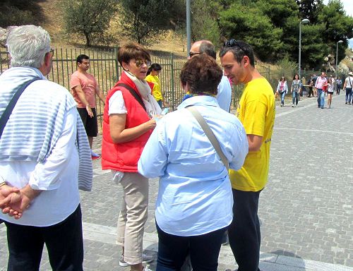 法轮功学员还在旅游景点雅典卫城(Acropolis)向游客们展示法轮功功法。祥和的炼功场面吸引了许多游客驻足。他们了解了法轮功,以及发生在中国的迫害,包括中共活体摘取法轮功学员器官的暴行。