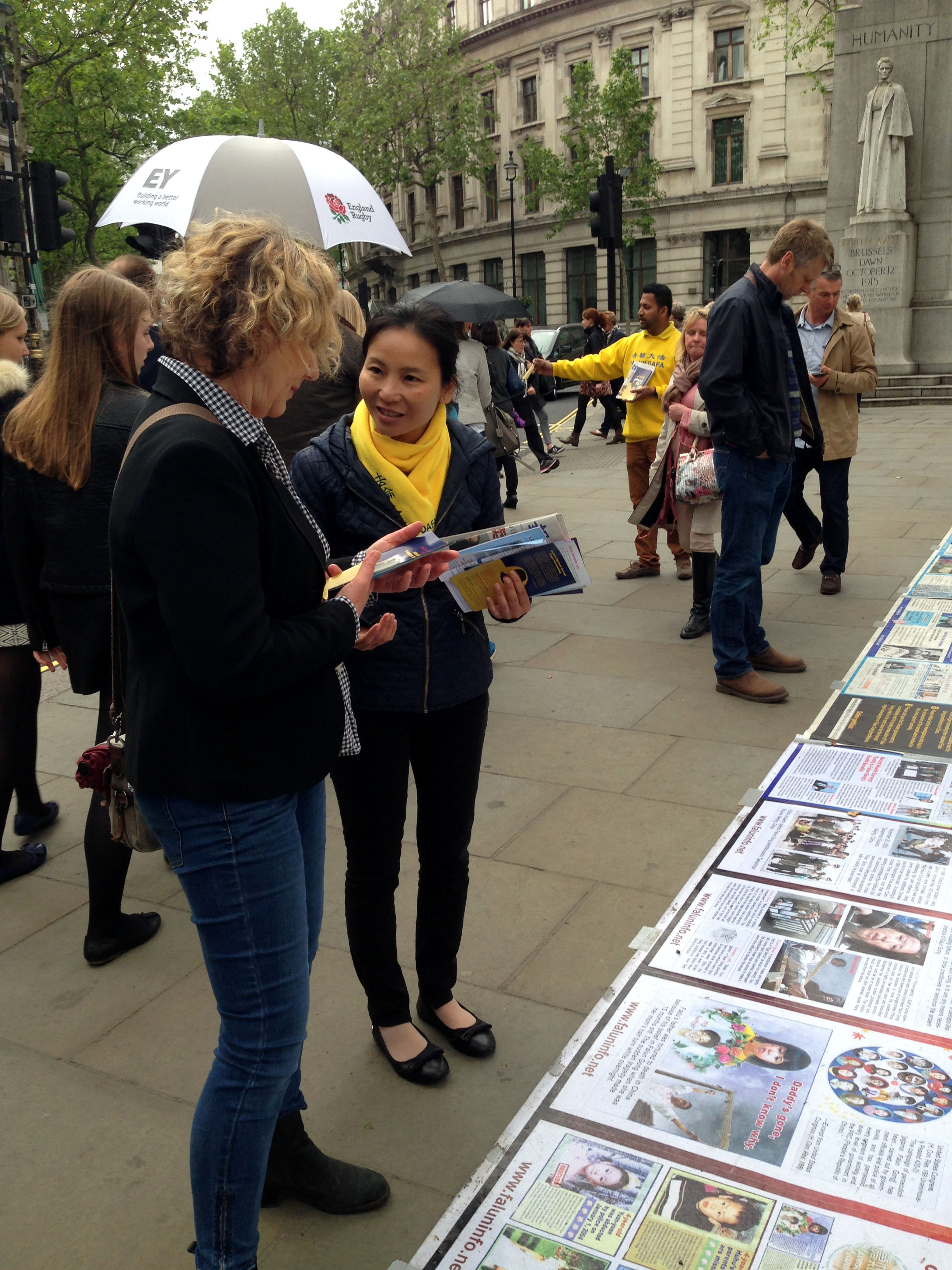 周末的圣马丁广场人流络绎不绝。有伦敦人,有来自伦敦以外居住在英伦三岛的人,还有来自欧洲、非洲、美洲、亚洲等世界各地的国际游客。法轮功学员的讲真相活动获得人们的支持。