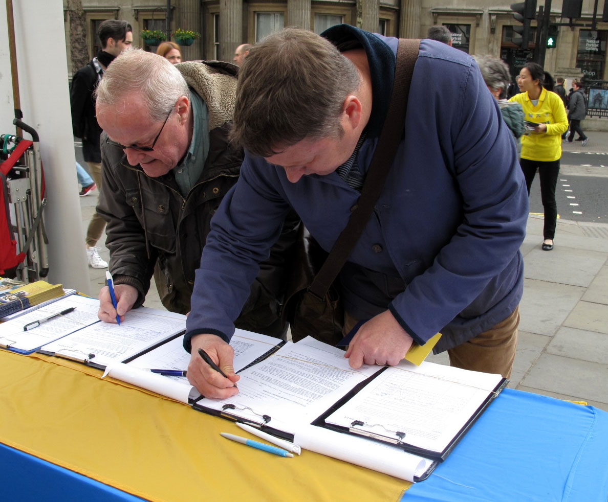 生活在伦敦的麦考义(McCoy)先生是位退休的图书馆员,周六下午路过圣马丁广场时停下脚步观看法轮功学员的炼功,他没有接传单,表示自己已经知道(法轮功真相)了,但他愿意签名支持法轮功学员反迫害。