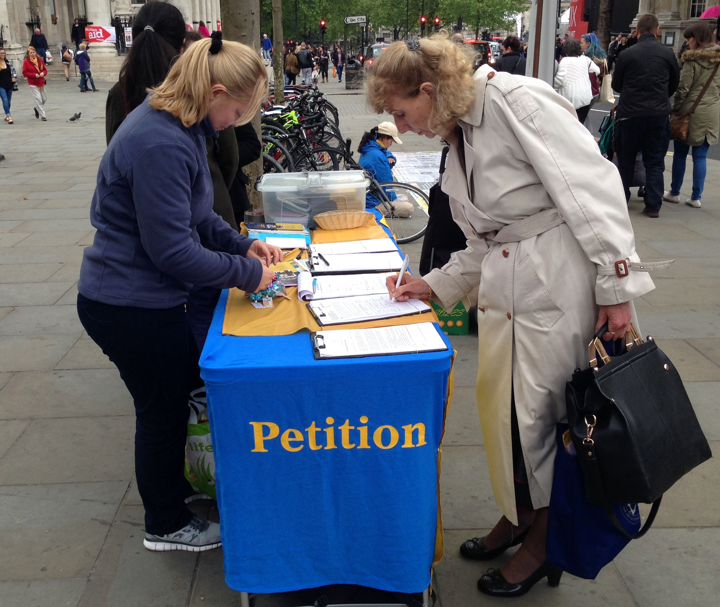 威尔士退休医生比迪(Pitt)女士周六这天来伦敦办事,路过圣马丁广场时遇到正在开展讲真相活动的法轮功学员,反活摘征签的展板吸引了她的目光。