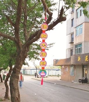 【明慧网二零一六年五月二十五日】二零一六年五月九日,在辽宁省抚顺市的城乡、农贸集市、街头巷尾、公园绿地、大街小巷、房前屋后展现的“法轮大法好、真善忍好”真相树挂,以及诉江展板和