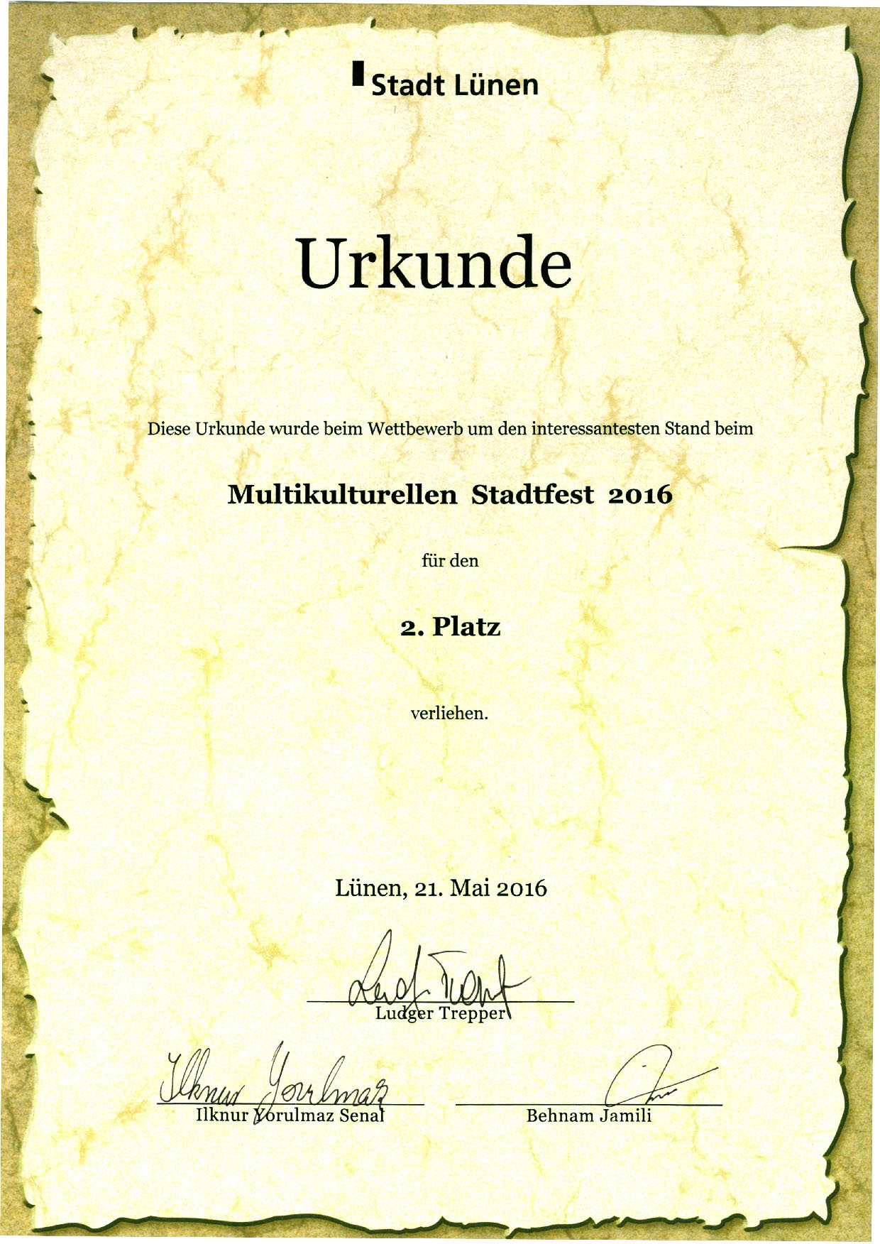 ![]() 图1:德国吕嫩市文化节,法轮功在三十六个展位的评比中获得第二名的获奖证书 |