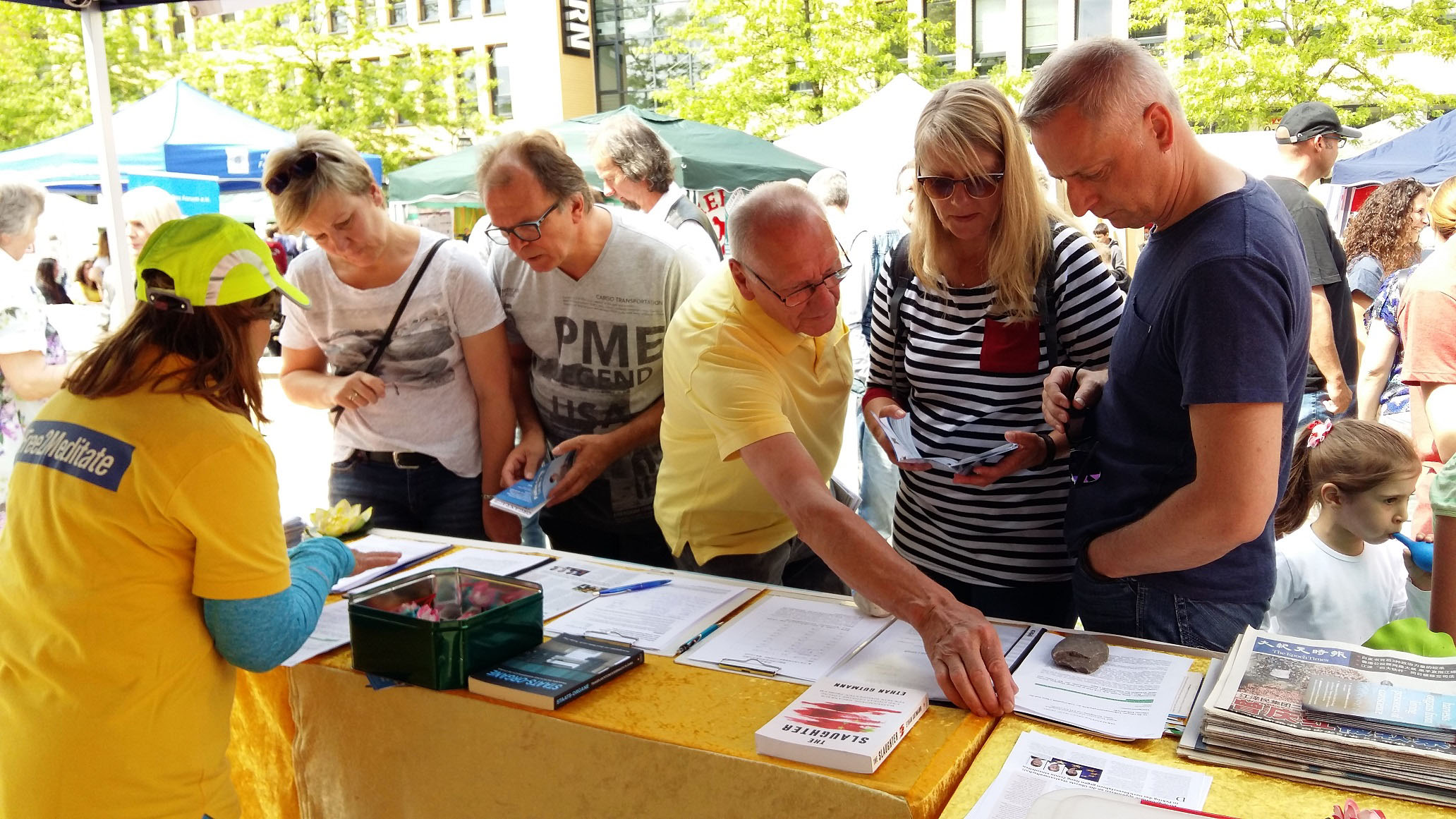 ![]() 图2:德国吕嫩市文化节,民众在展位上了解法轮功真相 |