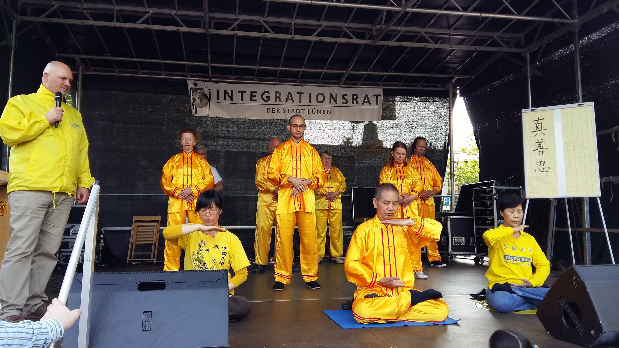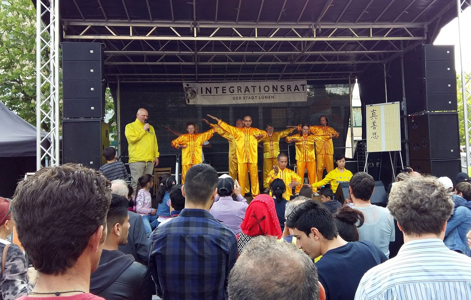 ![]() 图3-4:德国吕嫩市文化节,法轮功学员在舞台上进行功法展示 |