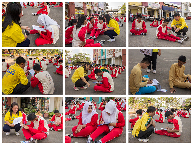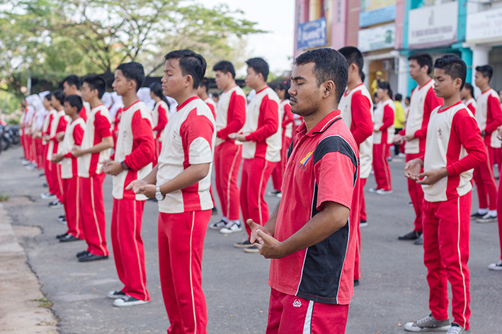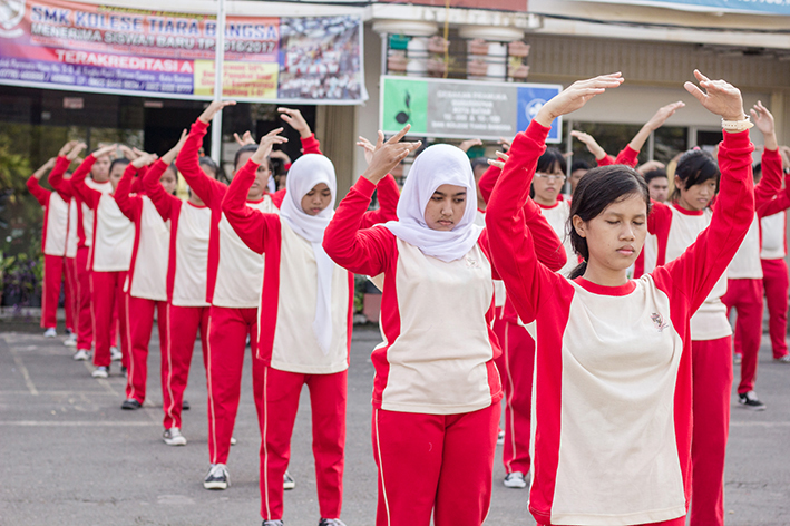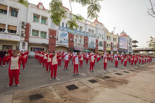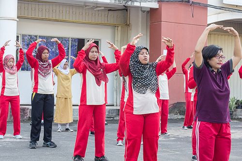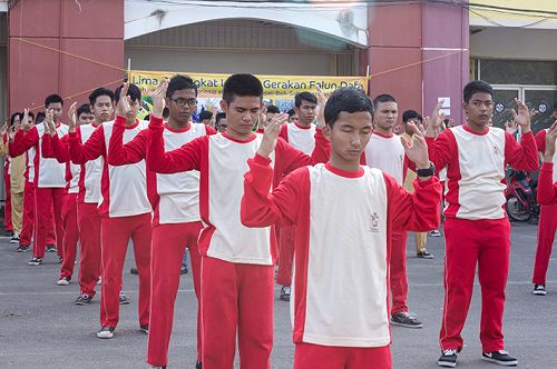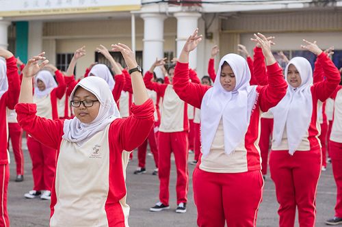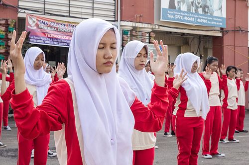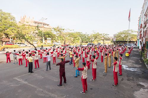 【明慧网二零一六年五月三日】二零一六年四月二十九日上午,印尼巴淡岛著名中学“国家皇冠学院”的一百五十名师生在数十名法轮大法修炼者的带领指导下,在校广场前集体晨炼法轮大法的五套功法。