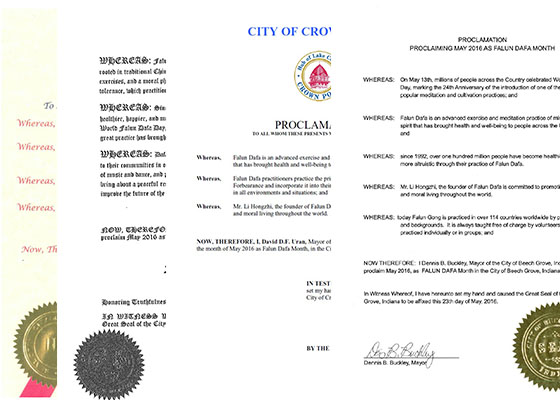 美国印第安纳州毕施格瑞市、布鲁夫顿市、文思尼斯市和柯朗波特市均于二零一六年五月宣布该月为当地的法轮大法月。