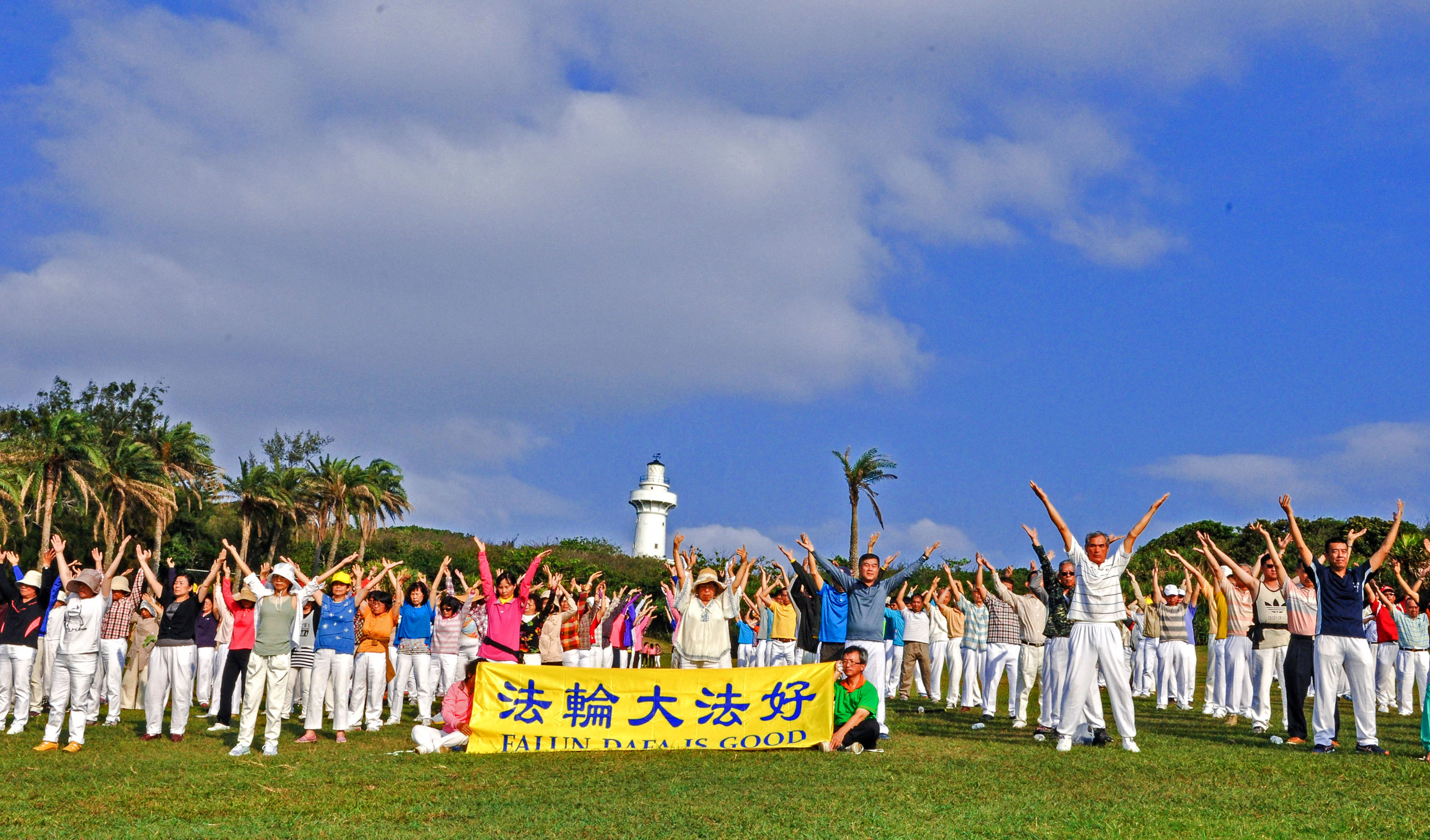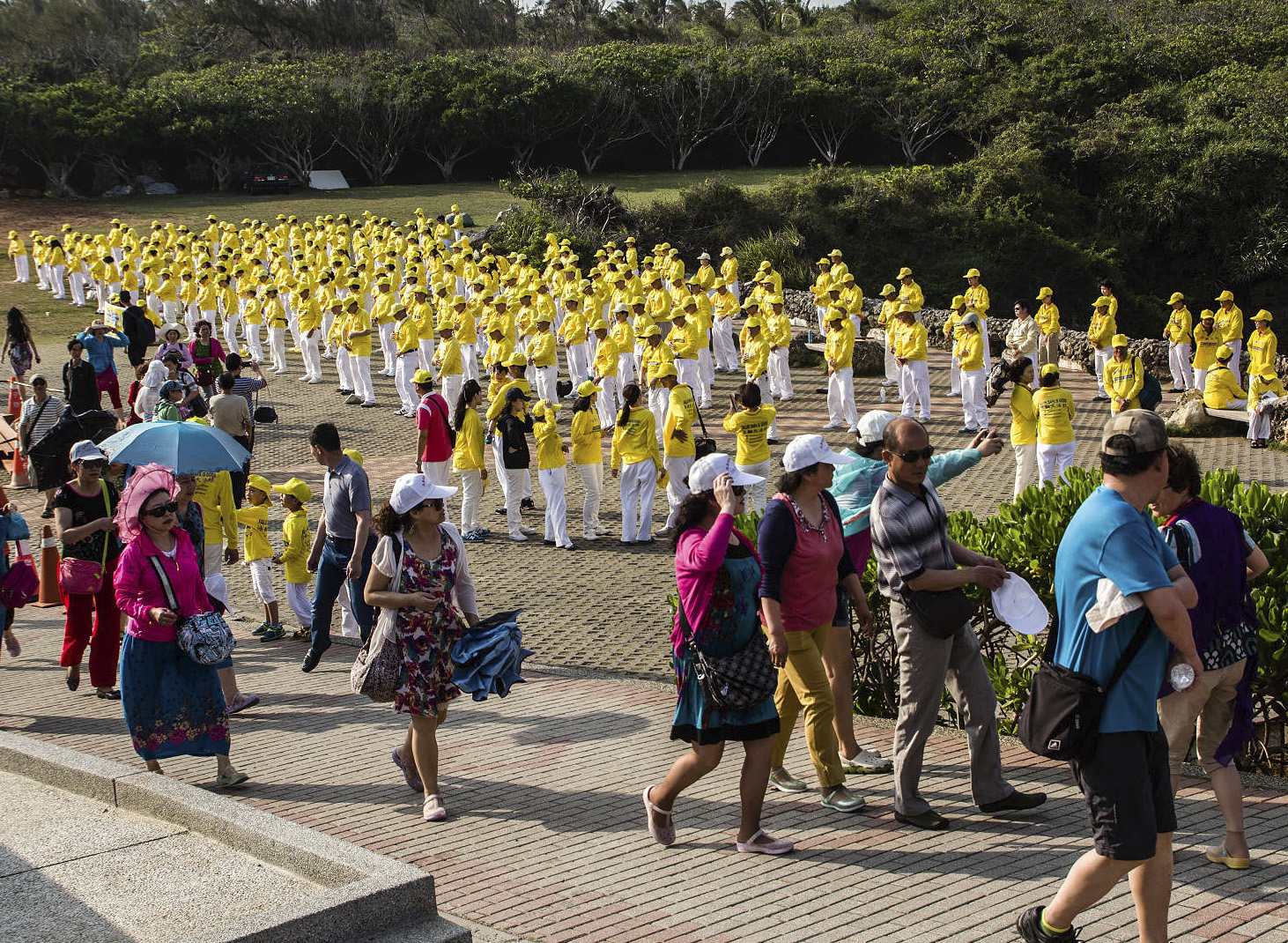 一群来自中国的游客,从鹅銮鼻灯塔阶梯下走,远远眺望平台上正在功法演示的法轮功学员,祥和的炼功音乐伴随着关于法轮功的介绍吸引他们的注意,其中一位先生很是吃惊地说:“又是法轮功!”大伙儿都笑了。一位法轮功学员跟他们说:“从台湾头到台湾尾,法轮功学员热诚欢迎你们的到来,现在海外世界各地大法弘传,台湾很自由,期盼多听多看,祝福你们旅途愉快!也能明智的为自己作选择。”其中一对夫妇缓缓走过来,请学员帮他们做退党声明。