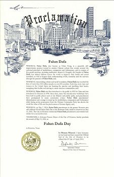 鉴于,法轮大法于一九九二年首次在中国传播,一九九六年洪传至休士顿。自此以后,在图书馆和公园举行许多法轮大法免费学习班,法轮大法修炼者参加了许多社区活动。面临着来自中国共产党的残酷迫害,法轮大法修炼者以决心和勇气坚守真、善、忍,向世界展示了生命的价值和人性的尊严。