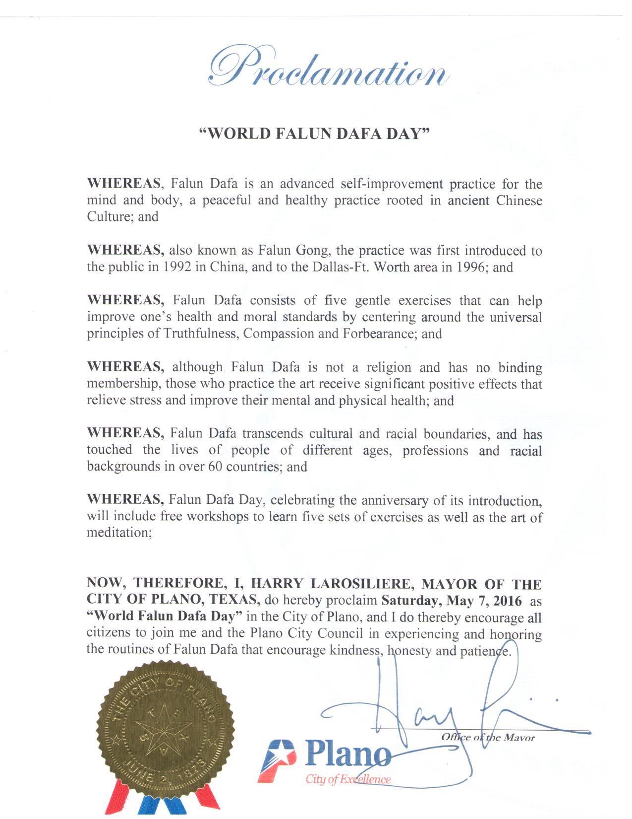 现在,因此,我,拉瑞·劳瑞斯利锐 ,布兰诺市市长,在此宣布星期六,二零一六年五月七日为布兰诺市的“世界法轮大法日“,并且我鼓励所有的居民与我和市议会一起体验、表彰法轮大法所提倡的善良、真诚和忍耐。