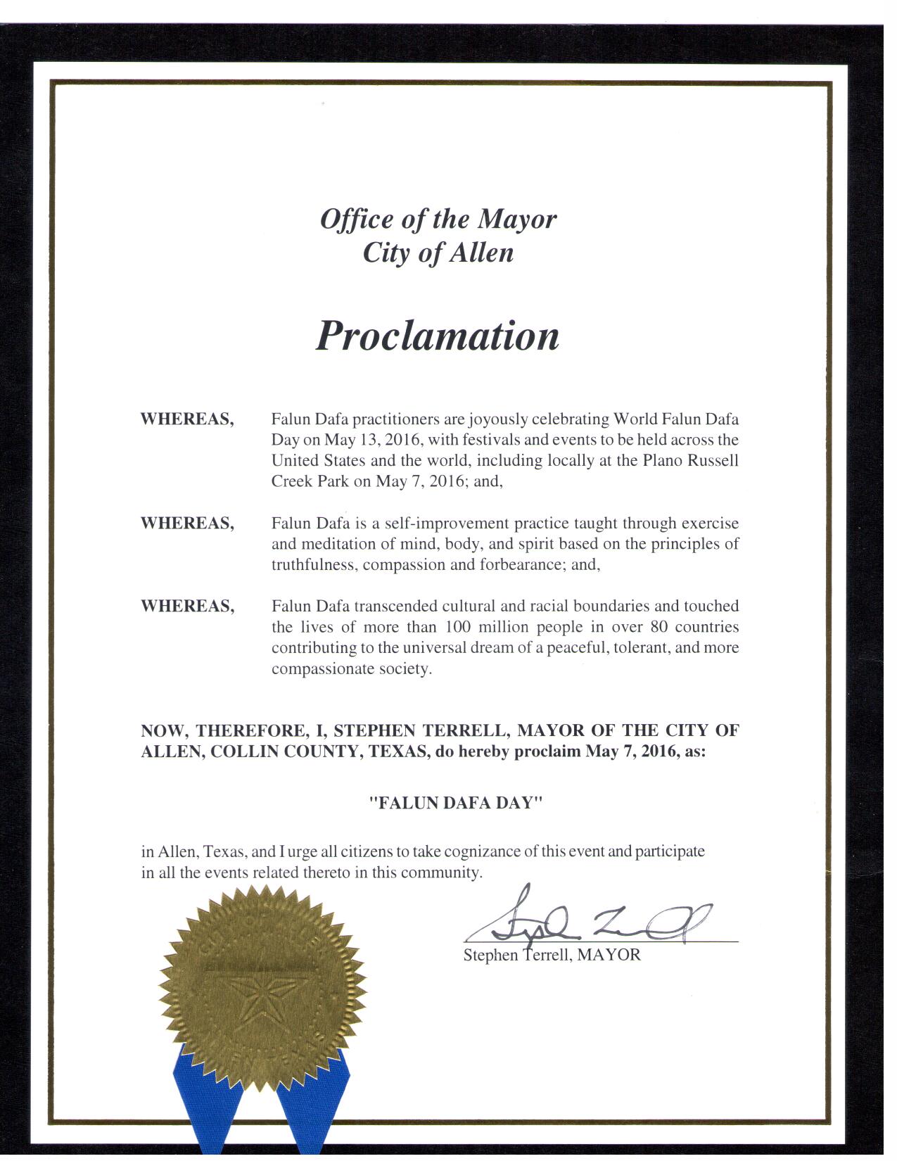 因此,我,史蒂夫·泰瑞尔(Stephen Terrell),艾伦市市长宣布二零一六年五月七日为“法轮大法日”