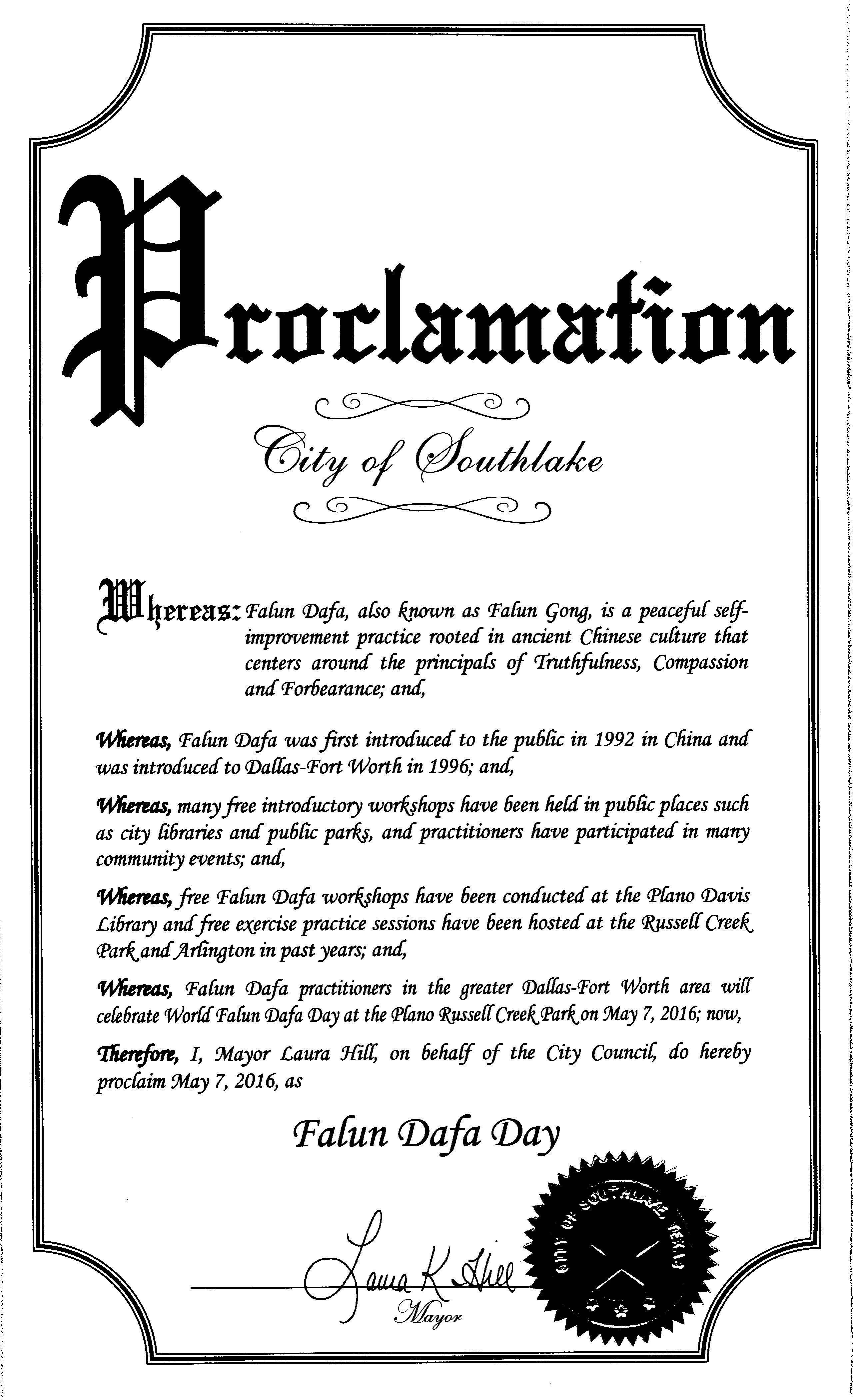 鉴此,我,劳拉·赫尔(Laura Hill),南湖市(Southlake)市长,代表市议会宣布二零一六年五月七日为“法轮大法日”。