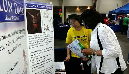 此次活动的室内展览区共有二百多个不同的参展机构,与法轮功展位相邻的工作人员也被吸引过来,了解了发生在中国大陆的迫害,有的感兴趣学功。
