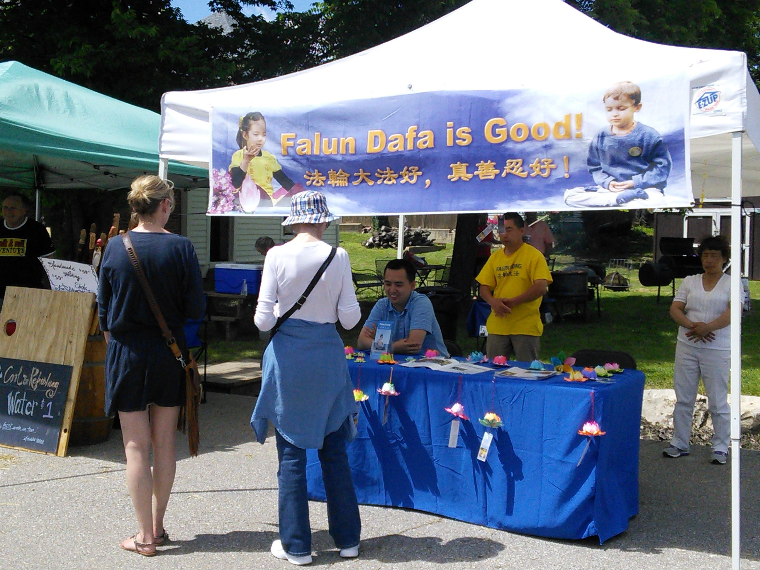 法轮功学员在展位上平静祥和的炼功吸引了许多人。不时有人前来了解功法的详细情况,也被展位上五彩缤纷的纸折莲花所吸引。旁边展位的人看到法轮功后也前来了解,很感兴趣,还想邀请法轮功学员们参加她们举办的聚会。她指着展位后面的房子说,“这是我的房子,我们定期会有小孩子在这里举办聚会,希望你们可以来教孩子们学习法轮功的五套功法。”