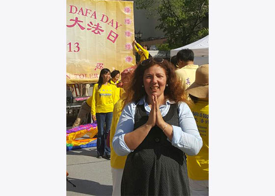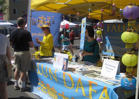 六月五日,加拿大卡尔加里市举办一年一度的丁香节。数十万游客和数千展位挤满市中心十多个街区。法轮功学员的展位吸引很多游客。