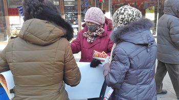 赶大集时,我们带着明慧年画,展开后,对大家说:“大家好,免费赠送年画了。”有的问:“是法轮功的不?”我说“是!”他们就都过来抢着要。有的说:“是法轮功的我就要,别的我不要。”有的还要给我们钱,基本上都是拿了年画,又做了三退。来不及退的,我们就大声的告诉他们,“一定要记住法轮大法好!”有的还激动的对我们说:“今天有零下三十多度呢,你们不冷吗?我请你们吃点饭吧!”有的说:“这么冷的天,别冻着了。”有的还帮我们戴好帽子、整理整理衣服,有的双手合十鞠躬谢我们。我们说:“您不用谢我们,是我们师父让我们来救你们的。”他们连忙说:“谢谢师父、谢谢师父!”