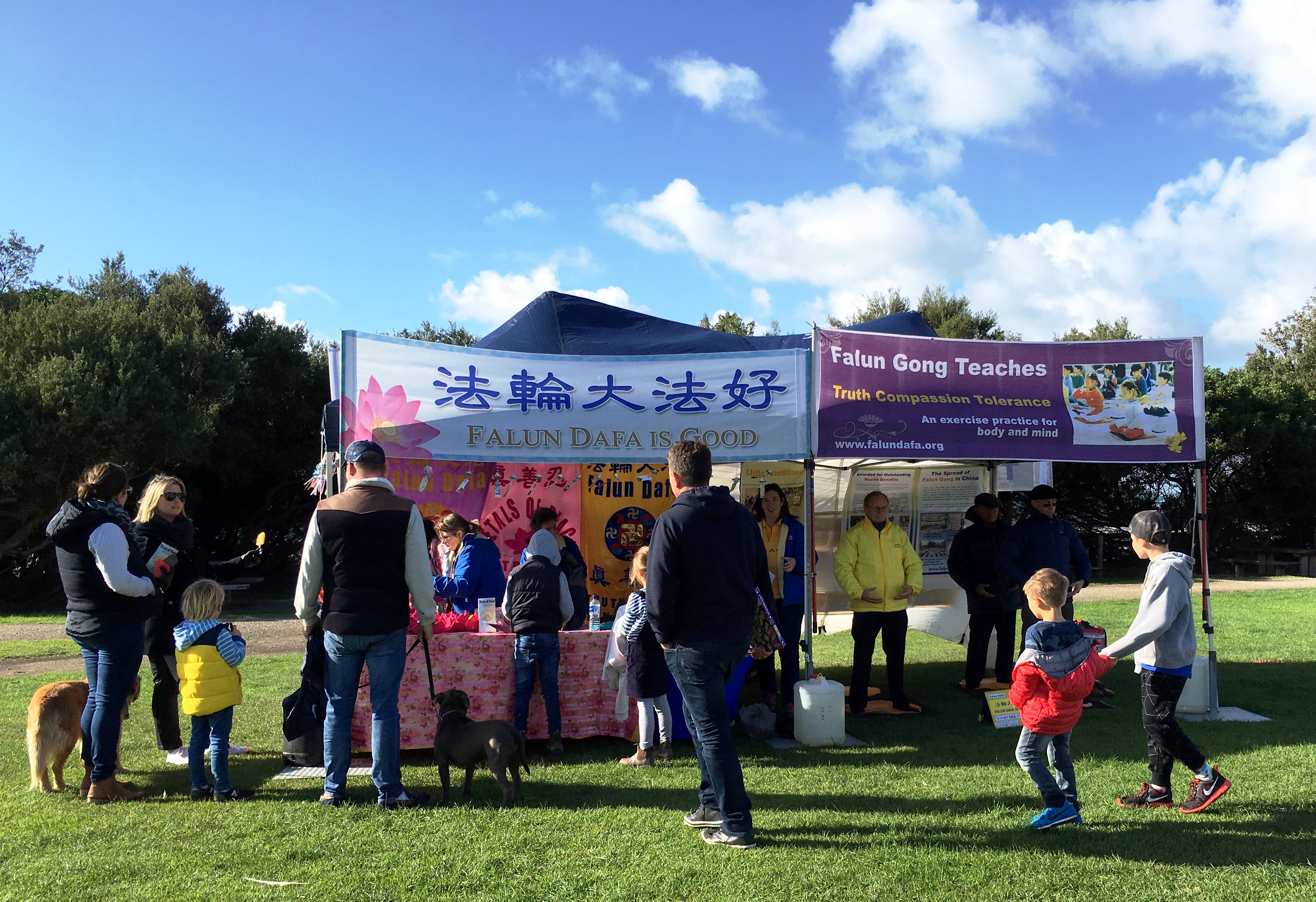 南半球冬雨时节,龙恩下了一夜的疾风骤雨,在上午市集开始不久停歇。灿烂的阳光下、风景如画的海滩上,“法轮大法好”的横幅分外醒目。法轮大法展位吸引人们驻足了解真相。