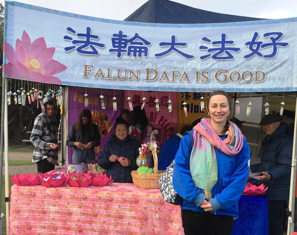 在墨尔本度假访友的德国法轮功学员穆勒(Veronika Mueller)女士,也参加了当天的活动。她回顾当初自己从了解法轮功真相到走入修炼的经历,那是在二零零二年一月,她说:“我当时是在著名的大学城哥廷根(Göttingen)市就读,经常看到有法轮功学员在市中心的街边炼功。终于有一天我觉得应该停下来,并详细的询问了什么是法轮功。”