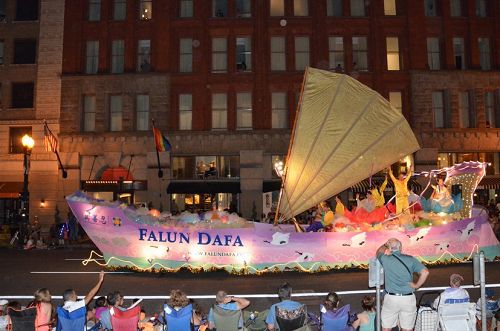 游行当天,从清晨六点法轮功学员就开始了花车的组装。在华氏一百零三度的高温下连续工作了几个小时,到下午两点,一辆造型新颖脱俗、构思巧妙的法船呈现在众人面前:莲紫色的船身,上面白鹤飞绕,绿色的幔帐围底,银灯饰于其间。船上金帆高悬,彩云环绕莲台左右。“法轮大法好”、“真善忍好”的字样和法轮图形饰于船头两侧,向人们传递着最珍贵的信息。
