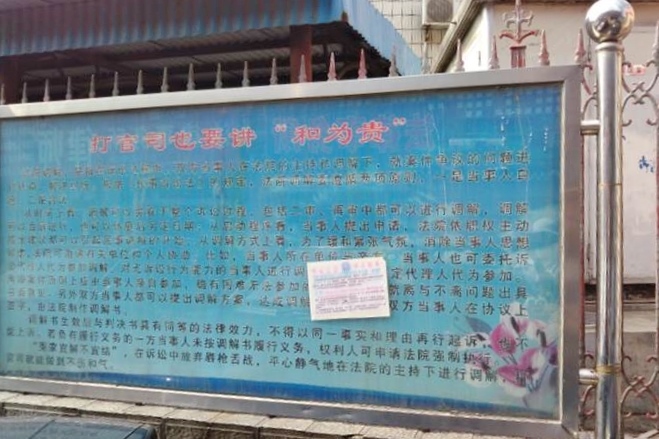 一张贴了九天的 “信仰无罪 停止迫害”的真相不干胶在法院门外的宣传栏内,告诫公、检、法、司信仰无罪,停止迫害