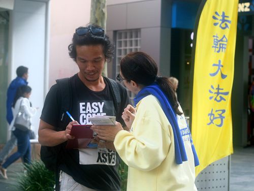 【明慧网二零一六年六月十七日】(明慧记者穆文清澳洲珀斯采访报道)“我想伸出援手,我想成为正的力量。”一个名叫Jlunya的澳大利亚少年如是说,二零一六年六月十一日,这名少年路过珀斯市中心步行街,看到了法轮功学员在这里演示法轮功的五套功法,并用标语和图片的方式揭露中共活摘器官的罪行,他在制止中共活摘器官的征签表上签下了自己的姓名。