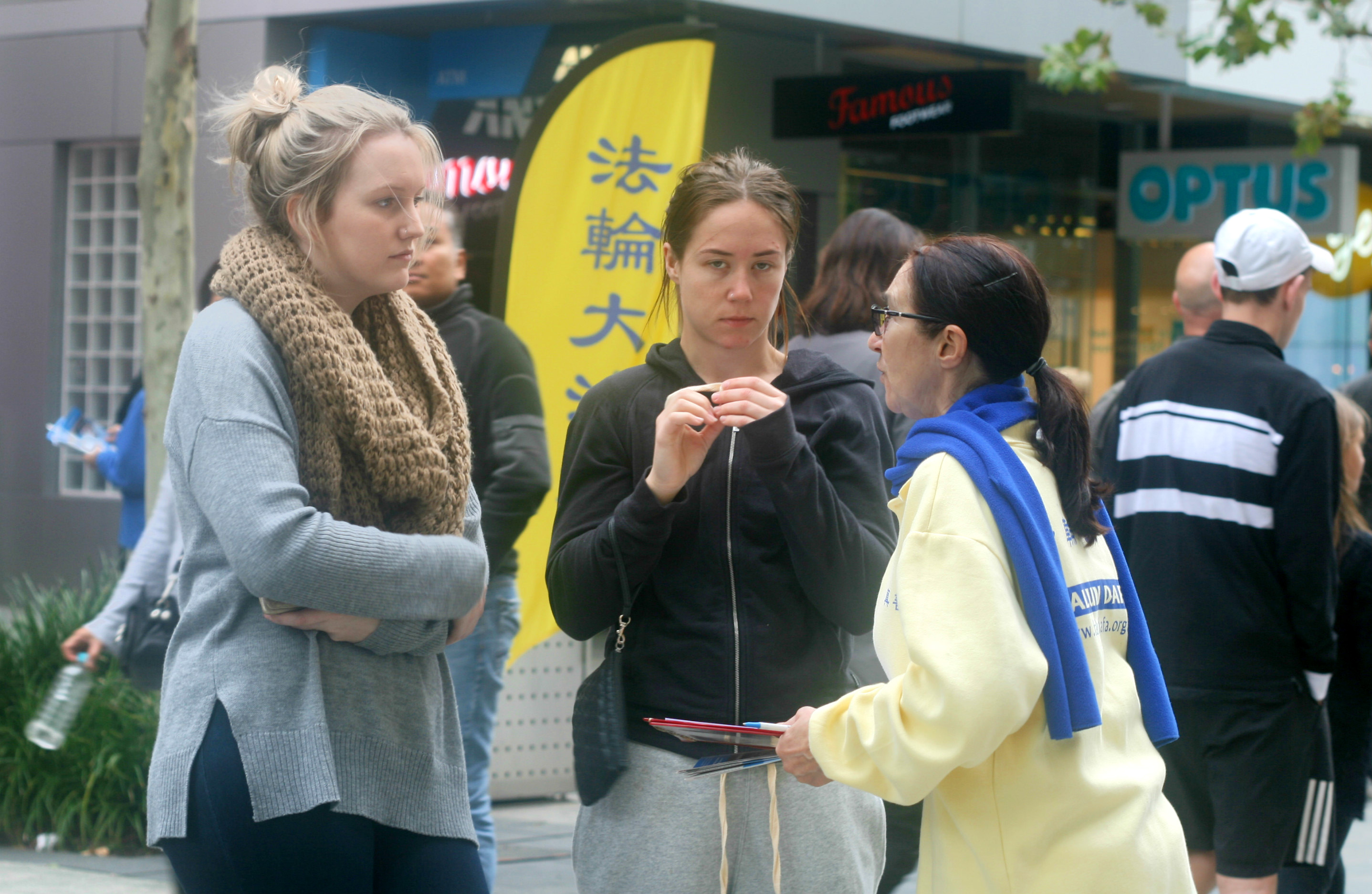 图1:二零一六年六月十一日,西澳部分法轮功学员在珀斯市中心步行街设立真相点,展示法轮大法五套功法,传播法轮功的真相。