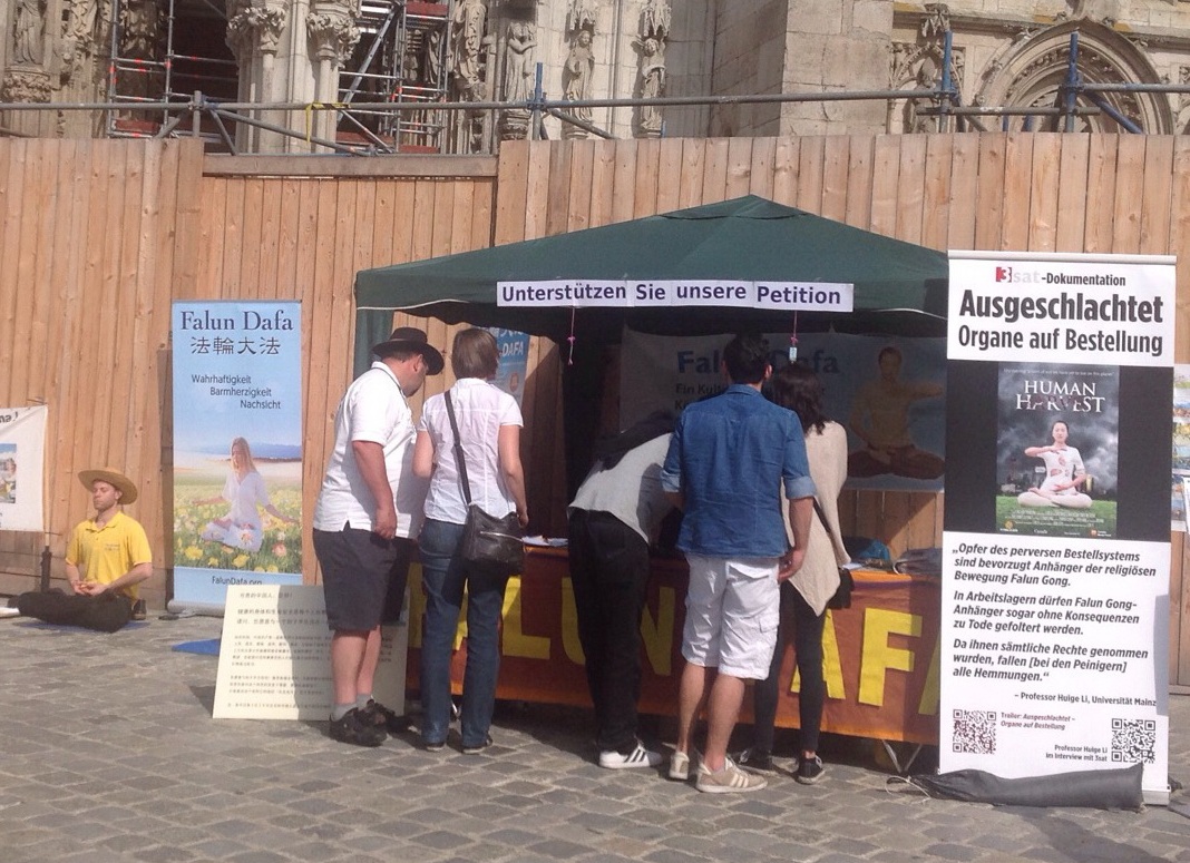 由于展台直接就在雷根斯堡地标式建筑——哥特式大教堂的前面,所以来往游客如织,有些甚至是从美国、台湾远道而来,也有不少从中国大陆来的旅游团。有一家三口从美国来的游客,看到学员在展示功法,很有兴趣地上前要了英文资料,得知事情的来龙去脉后,他们非常惊讶,都在征签表上签了名。他们表示,很高兴能在德国获知这么重要的信息,回去后会在网上了解更多相关的真相。