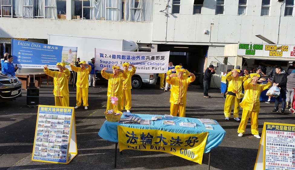 活动的最后,一对卖小商品的华人夫妇很幸运地做了“三退”。他们二人此前都是中共党员,由于第二天就要回国,所以临时在这里摆摊甩货。学员说能这样见到真是有缘份,夫妇俩很高兴地听真相,很快做了“三退”。其中那位华人男士表示他当初差点就学炼了法轮功。他向学员询问当年的天安门自焚到底怎么回事。了解到那是中共一手炮制、嫁祸法轮功学员的骗局后,他很高兴地说“一定要好好了解法轮功”。当他们了解到法轮功学员是义务教功后,十分兴奋,当即留了两位学员的联络方式,表示一定保持联系,等回到新西兰时再找她们学功。