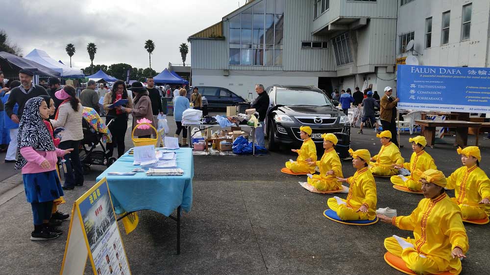 腰鼓队的表演以及法轮功功法展示吸引了大量路人观看。很多带着孩子的毛利及印度市民在旁饶有兴趣地观看并拍照。其中有一位七岁左右的中东小女孩站在资料摊位前,闭上眼睛有模有样地学炼静功动作,面容祥和。有位五、六岁的毛利小女孩非常喜欢学员制作的莲花护身符,一下要了七个,说想要送给自己的小伙伴们。学员告诉她要记得也告诉小朋友“法轮大法好”,念了会有福报。小女孩高兴地点头答应。