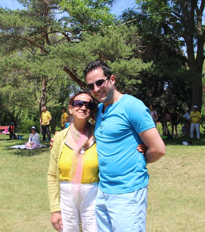 多伦多居民Rousdeh和妻子带着来自伊朗的妈妈Ashras来游玩。看到明慧学校小朋友和家长在炼功的场面,妈妈Ashras表示一定要学这个功法,儿子Rousdeh和妻子耐心等待着她学炼功法,夫妻俩就在旁边听学员的介绍。不会讲英文的妈妈学完功法后,跟儿子表示自己非常喜欢,儿子和儿媳妇都表示:一定要帮妈妈找到在多伦多的炼功点。拿到有多伦多炼功点信息的传单时,他们一家都兴奋地说:“谢谢,谢谢!”
