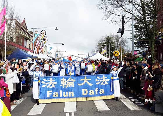六月十八日,蓝山卡通巴地区的冬季奇观艺术节游行吸引了现场大约四万观众观看,人们交口称赞法轮功游行队伍。