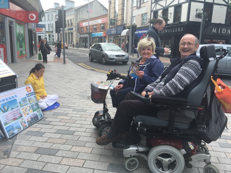 图1:二零一六年六月二十一日下午,北爱尔兰法轮功学员在利斯本(Lisburn)举办征签活动,传播法轮功的真相,并征集签名制止迫害。